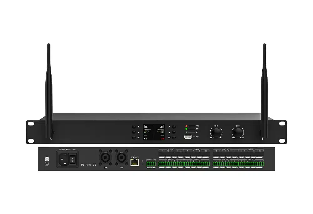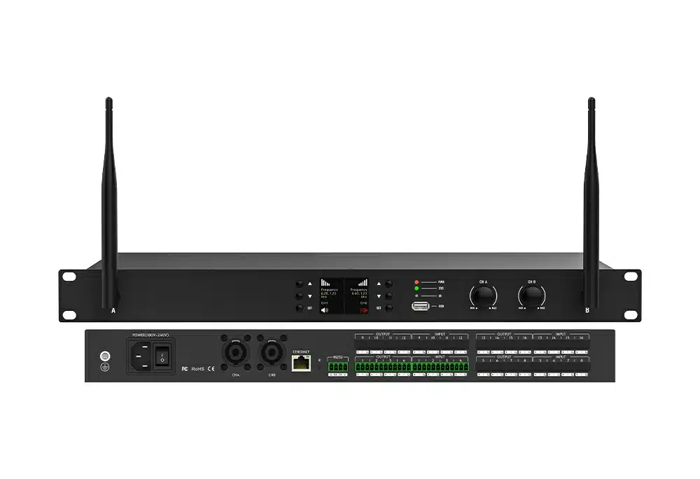 该数字音频处理器是一款集数字功放和无线麦克风的音频处理设备。采用先进DSP处理技术,拥有全新的自动混音、反馈消除等算法,内置两通道数字功放模块,具有更显著的能效比,在过载保护和失真控制也有良好表现,另增设两通道U段无线麦克风可以选配手持话筒或领夹麦克风,针对性的解决应用场景中的各种实际问题,配合声菲特其他音频产品,能满足更多场景应用需求。