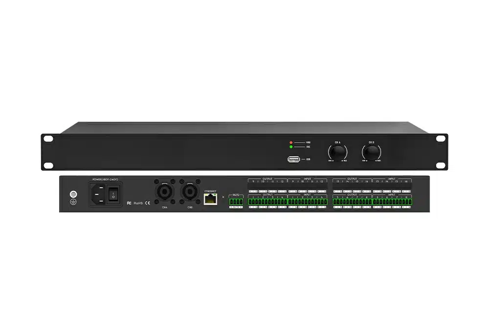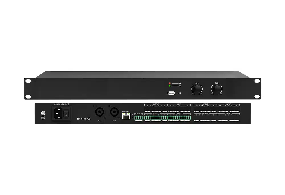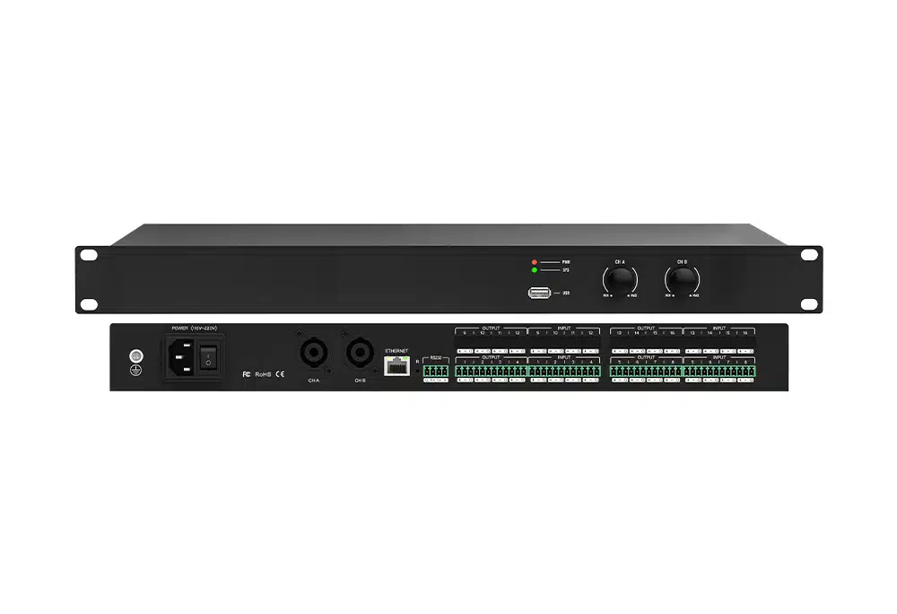 该数字音频处理器凭借高性能32-bit浮点DSP处理器、48kHz采样率以及24-bit高精度A/D、D/A转换器,精准捕捉音频细节,确保声音纯净真实。其核心亮点是高品质17级前置放大电路,可提升音频质量并保持细腻层次感。DSP处理总线集成多种核心算法,如反馈消除、噪声消除、回声消除和自动混音,智能优化音频信号去除干扰杂音还原高品质声音。此外配备强大矩阵混音功能,支持多组场景预设与保存,满足不同场景需求。人性化的操作软件界面简洁直观,便于用户快速上手完成复杂设置。广泛应用于商务会议中心、远程会议、公共扩声系统以及体育场馆等大型场所,是专业场所音频处理的利器,为用户带来极致音频体验。